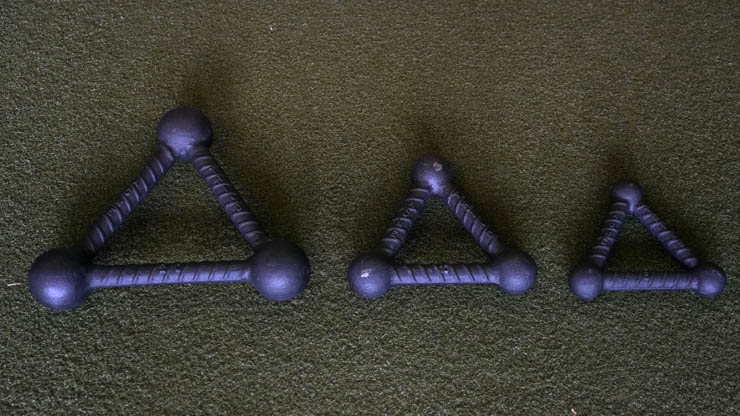 The Acme Sledgeworks Triads are a triangle-shaped piece of equipment that ranges in weight from 5 to 20 pounds and may be used in the same way as kettlebells and dumbbells are used.