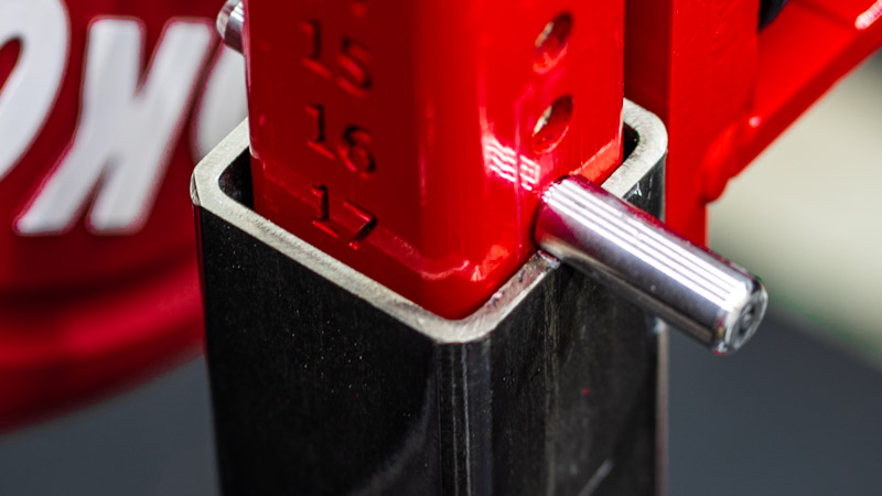 The last adjustment point I want to highlight, and the one that will most often be used is the adjustment of the uprights. In order to raise and lower the uprights, even while the bar is loaded with 1,000 LB or more, the uprights use a pin and hole along with a lever mechanism to provide leverage when adjusting the height of the bar for different lifters.