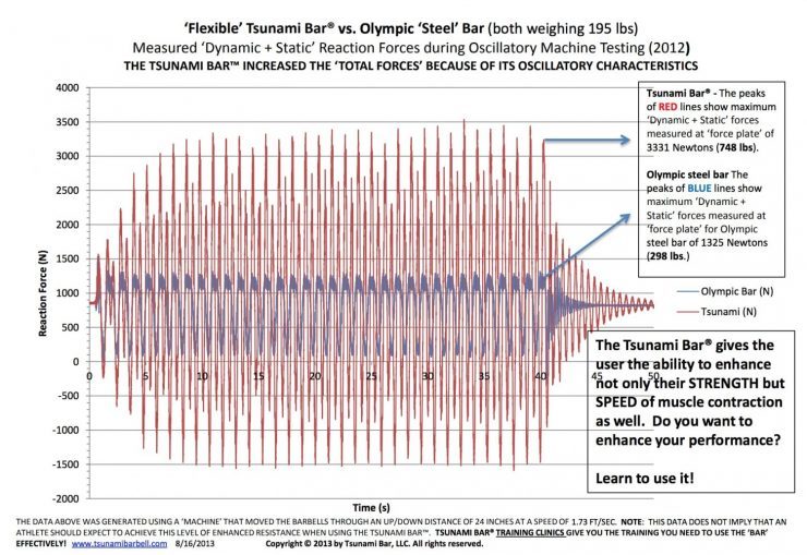 In addition, Tsunami Barbell has a chart showing the “Measured Dynamic + Static Reaction Forces during Oscillatory Machine Testing.” In other words, they strapped two bars to a machine that oscillated up and down and measured the reaction forces. Due to its oscillatory characteristics, it was determined that the Tsunami Bar increased the “total forces” dramatically compared to an Olympic Barbell.