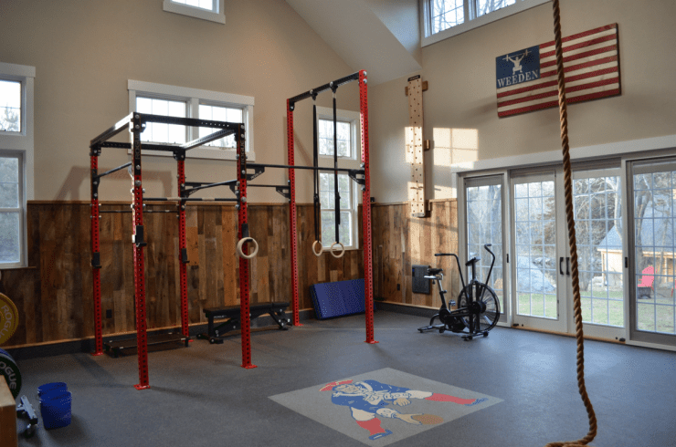If you absolutely hate the Patriots, then you should probably keep scrolling. This homegym not only has the Patriots original logo in the center fo the floor, but the rack is built to match this families favorite teams colors.