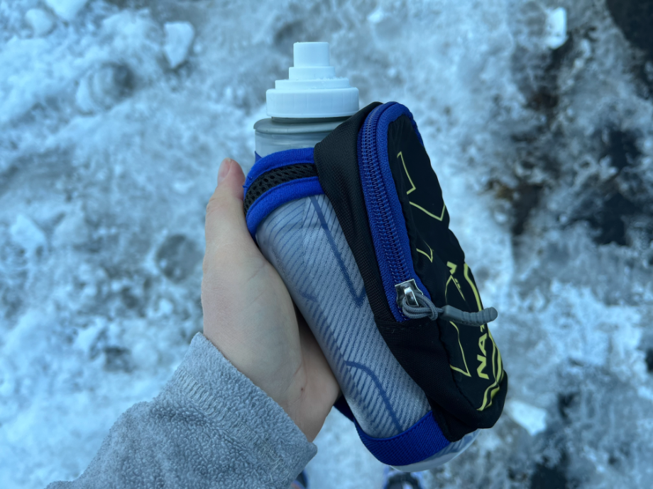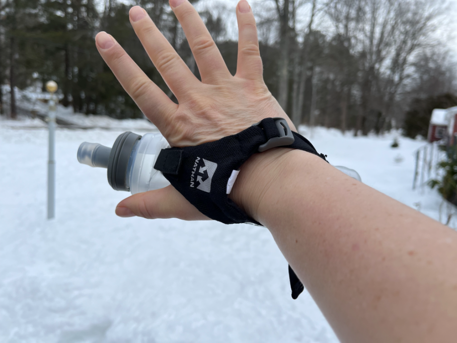 The Nathan hydration belt is super comfortable and I’ve even made adjustments to the waist strap and worn it over a jacket while cross-country skiing. With gloves on, the water bottles are a little harder to grab and open the push-pull style cap, but still doable. However, I assume most folks won’t be using this belt with a pair of ski poles in hand.