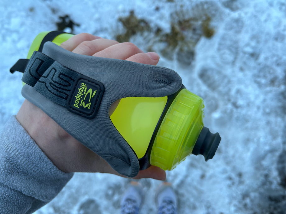The Amphipod features a push-pull cap that will require your opposite hand to pull up and unlock the spout. Although this water bottle is super simple and doesn’t offer any storage compartments like the Nathan SpeedDraw, it does offer two slots for energy gels on the outside of the hand strap.