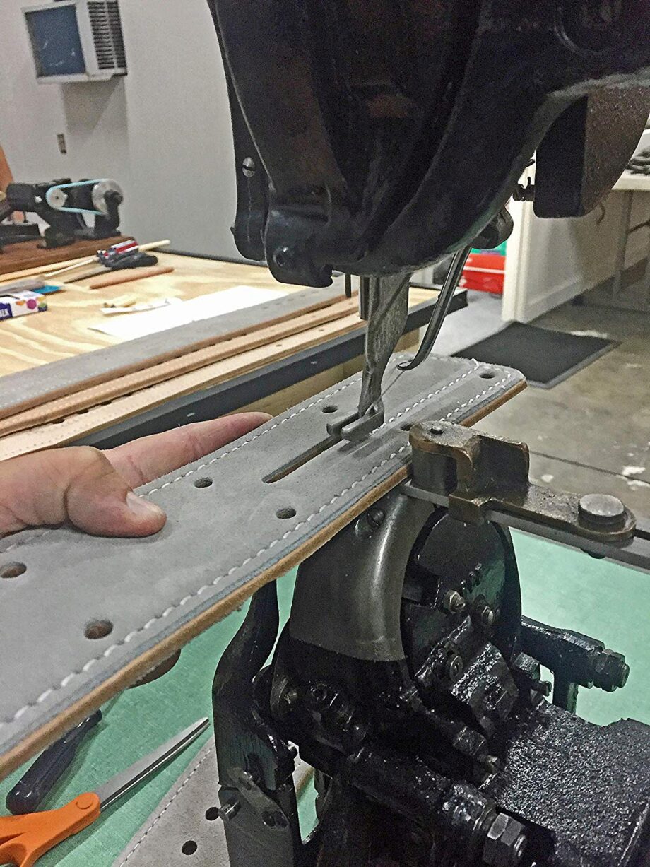 The layers of the belt should, in most cases, be stitched when using leather. The more stitching, the better (up to a certain point). Most manufacturers typically use glue to prevent bubbling between the layers. The stitching itself should overlap to prevent the stitching from coming undone over time.