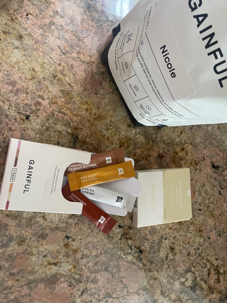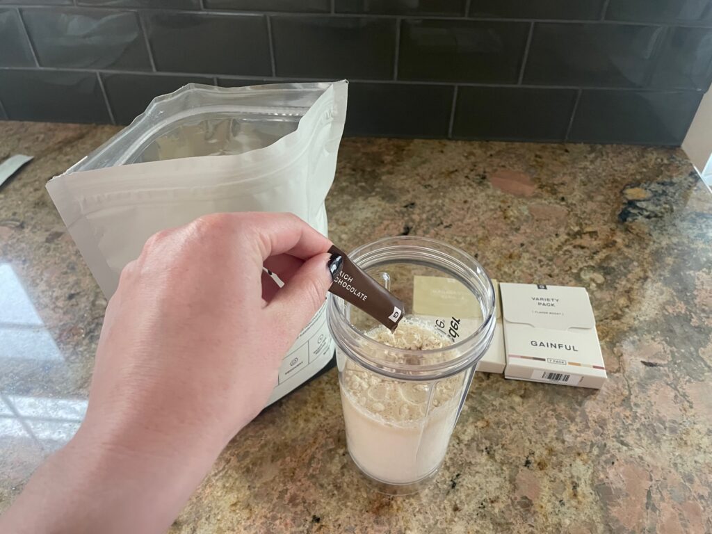Gainful protein is really interesting in that the actual protein powder is always unflavored, but your order comes with “flavor boosts” to customize the flavor. Nicole really liked this feature, saying, “I like that you can control how much flavor you want in each shake via the packs, and even mix them, like chocolate and vanilla for instance.”