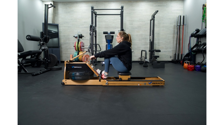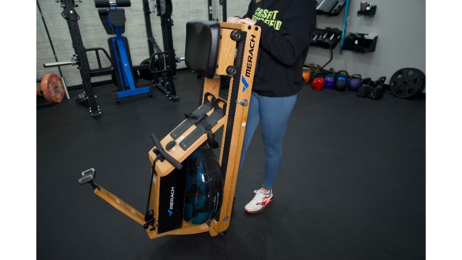 Lindsay says the MERACH 950 is lightweight (85 pounds dry) and easy to cart around with transport wheels. “The wheels on the front are pretty decent—I had no problems rolling it on the gym floor or the turf we have at GGR HQ,” she says.