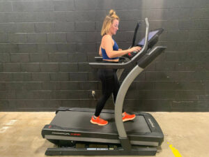 The 22-inch screen is huge and excellent for iFIT. It feels super immersive and really provides a boutique studio class experience. The quick-select buttons are great, located on the side, Caroline describes, and the incline, decline, and speed all change quickly. It’s pretty quiet as far as treadmills go, although the fans are kind of loud. The fan hits Caroline’s 5-foot-9 frame in the perfect spot, with cool air wafting toward her face, neck, and chest.