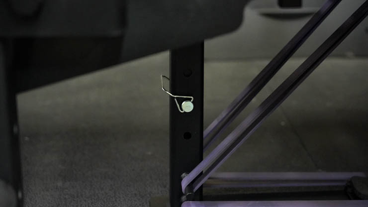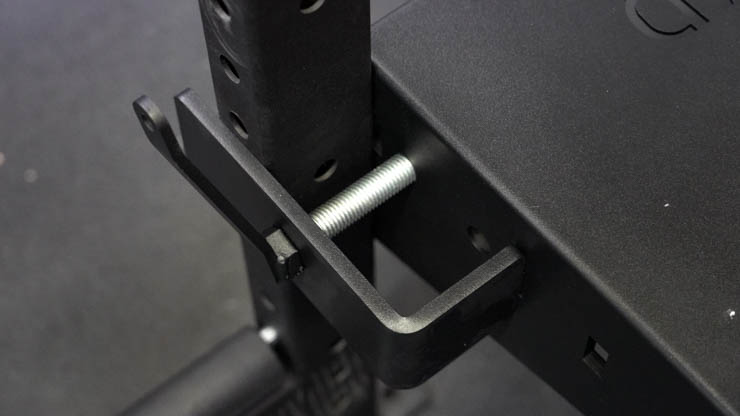 The platform itself attaches to the rack using J-Hook looking attachments and hand-tightened bolts that essentially allow the unit to become as stable as your power rack is. There are multiple places on the platform for the j-hooks to fit and this allows the Squatmax-MD to attach to just about any pair of uprights from 20″ to 50″ apart.