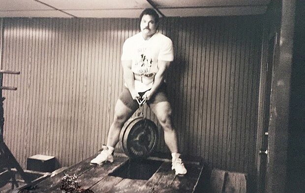 Although Louie Simmons wasn’t the first guy to add some weight attached to his hips and squat down, he is the first one that I’m aware of (feel free to provide a factual and provable rebuttal) to create a platform to squat through (that was at least made known.) In fact, this is the first picture I ever saw of someone belt squatting.
