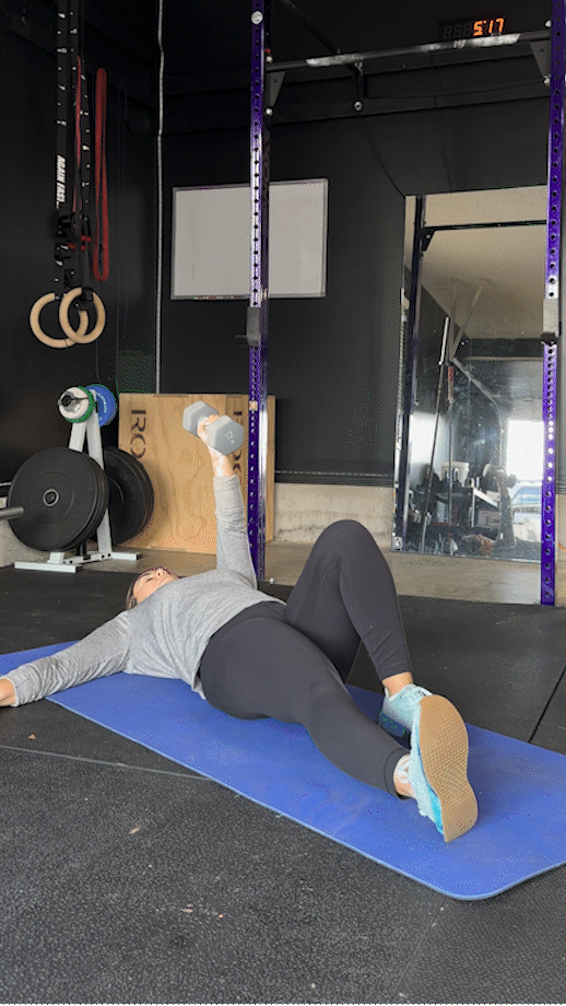 - Position yourself on the floor, lying face up, holding a kettlebell or dumbbell in your right hand.